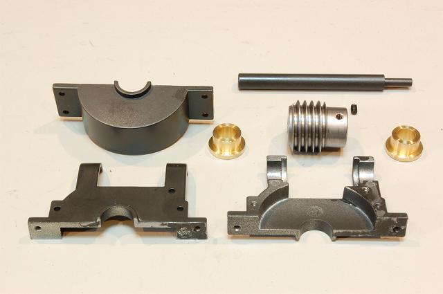 2010.04.08 ウォームギヤを左右軸受で挟み込み、下から第3動輪の駆動ギヤを覆い隠すような パーツ構成である。つや消しの黒塗装がカッコ良くて、ついつい嬉しくなってしまう。 |