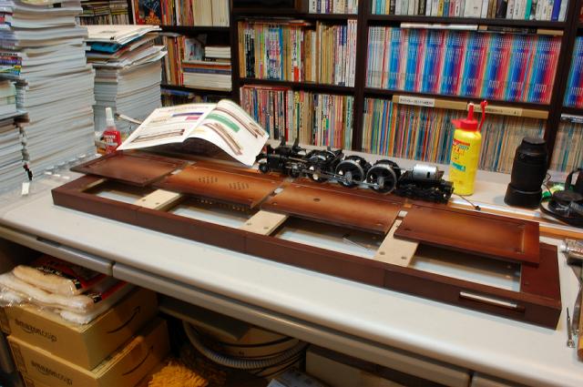 2010.04.08 引き続き従台車ユニットを取り付ける。独特の灰箱の形は、従台車の車軸を避ける ためのカタチだったことが良く判る。 |